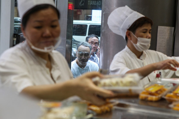 顾客在光明村大酒楼排队购买食品
